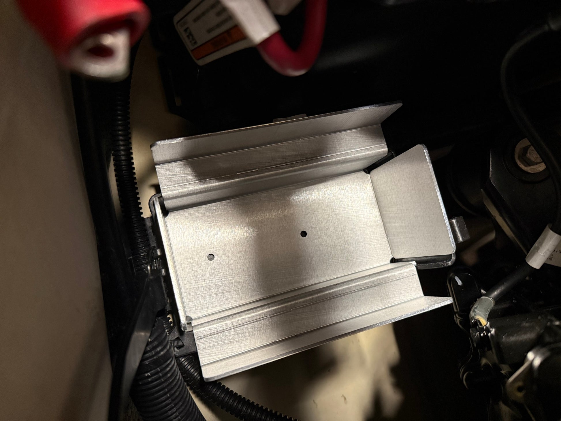 - The battery tray adapter will be snug in the factory battery tray. There are 2 stainless steel self-tapping screws you can use to fix the bracket in place if you wish.
